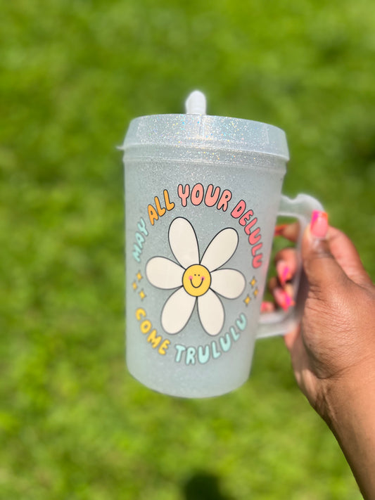 34 oz Guzzler perfect for the summer months! Cute motivational message.Double walled, bright glittered color. Straw with topper. Keeps drinks cool.